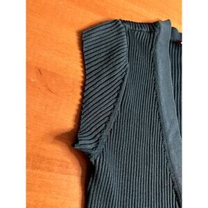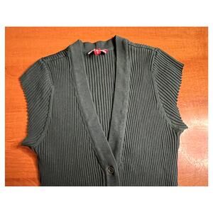 Green striped knit (65% Viscose, 35% Nylon). Sweater sheath. Long sleeves. V-neck. Front button closure. 49"" from shoulder to hemline. Imported.