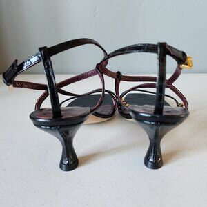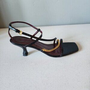 "NEW" Beautiful Black Croc Embossed Leather Gita Chain Sandals By Staud. Gold-Tone Single Chain Accent on Right Shoe, Squarish Toe, Adjustable Ankle Strap, Leather Upper, Lining, Cushioned Foot Bed & Soles, Leather Wrapped Low 2.5" Heel, Made in Portugal, New, Never Worn, Only Tried On:) Rt.350.00 approx. Size 37.5/ 7.5, Foot Bed Measures 9.1/4" for Reference. * Perfect Low Heel for Any Occasion.