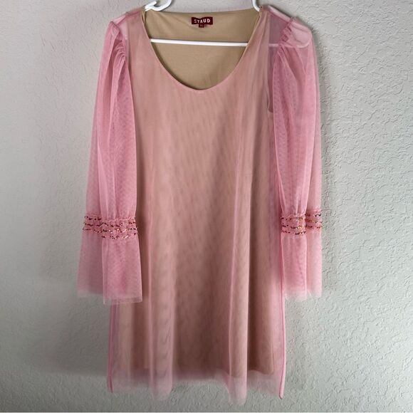 Staud Sheer Tulle Shift Dress w/Beaded Bell Sleeves Nude Lining Size XS