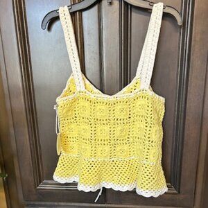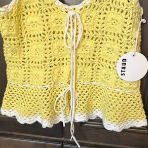 Staud Shirmp 100% Cotton Sleeveless Crochet Peplum Top in Yellow/White