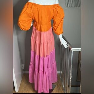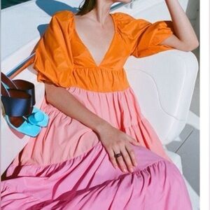This is a beautiful Colorblocked and full of flattering volume, this groovy A-line maxi from Staud features a sexy plunge neckline framed by trend-right puff sleeves. Pink and orange colorblocked nylon (100% Recycled nylon). Maxi. Puffer sleeves. Deep V-neckline. Hidden back zipper closure. Imported. No odors. No stains. Hidden pockets
