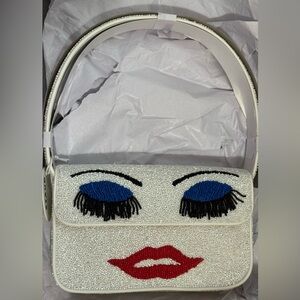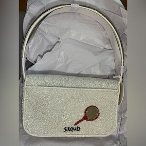 Chic STAUD handbag with intricate red and black beadwork. Stylish accessory for any ensemble.