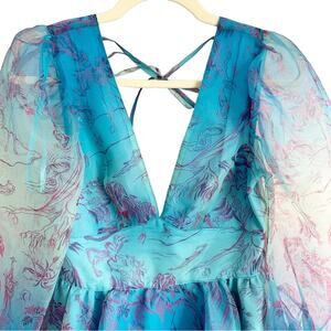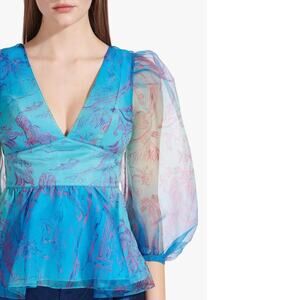 blue, Staud, blouse, top, sheer, organza, peplum, puffSleeve, romantic, feminine, statement, designer, chic, modern, elevated, cocktail, luxe, runway, elegant, C2