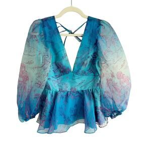 Features: V-neck front and back, self-tie, sheer balloon sleeves, peplum hem, button cuffs