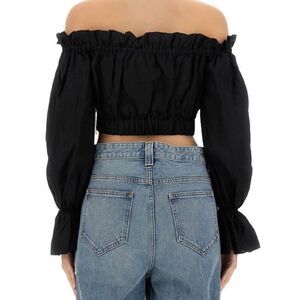 Staud Tristan linen black off shoulder puff sleeve crop top.