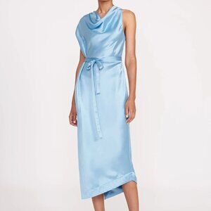 An asymmetrical midi dress crafted from a satin fabric, the Troupe features a cowl neck, tie at the waist, and thigh-high slit. Pair with a silver heel and you're ready for any evening affair!