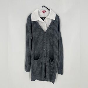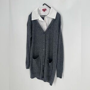 Collared poplin shirt which can be removable and the knit sweater cardigan can be worn as a dress alone or just a cardigan.