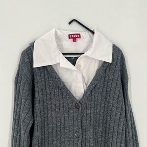 Staud Wallis Mixed Media Collar Shirt Cardigan Sweater Dress In Charcoal White
