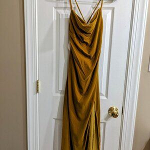 Never worn, beautifully done lace up detail in the back with a zipper, and very lush fabric texture. Color just didn't match my skin tone well.