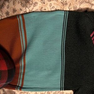 Bold staud dress with multicolor stripes. Features pink, teal, red, and mustard tones. Ideal for a standout look.