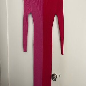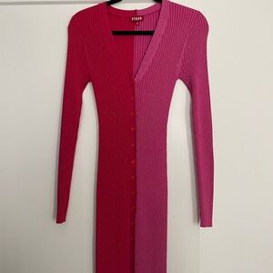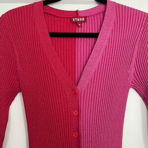 Staud designed the Shoko colorblocked midi-dress to be worn as a cardigan or a dress. Fashioned in a body-con silhouette, this two-toned style highlights a plunging V-neck and dainty, tonal buttons down the front.