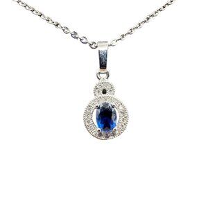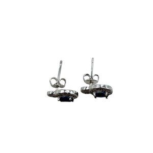 Oval-cut center lab created blue stones are framed in clear miligrain settings