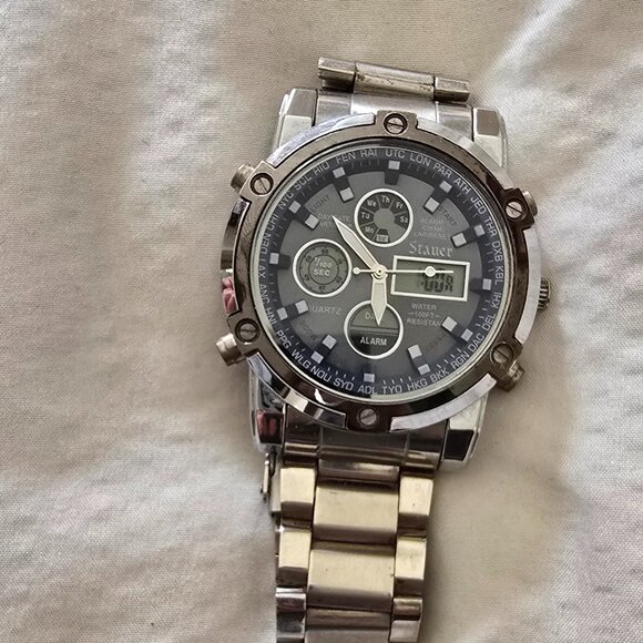 This Stauer wristwatch features a beautiful blue stone set in a polished silver case. The chronograph style allows for precise timekeeping, while the butterfly clasp ensures a secure fit on the wrist. The watch is preowned and comes without box, but it is in good working order.