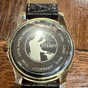 NOS in the box with tags. 1929 inspired gold fused stainless steel quartz watch. Black Croc embossed leather band. Blue breguet hands. Sapphire color crown.