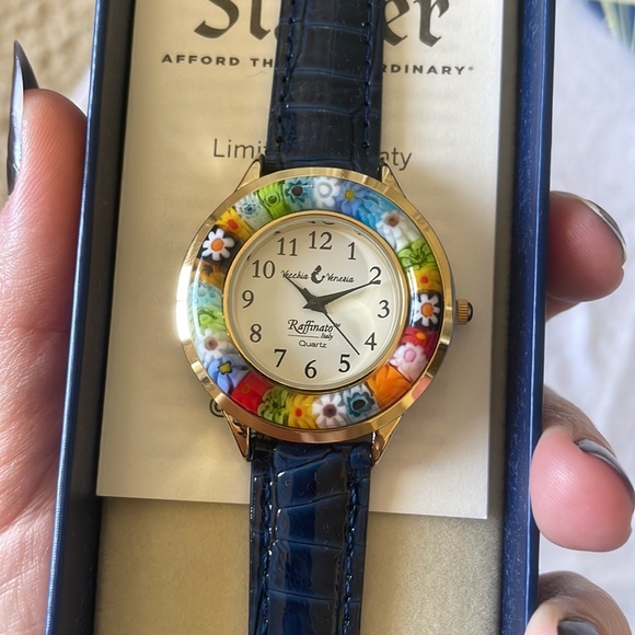 BRAND NEW in the box, never worn. Perfect condition BUT needs a new battery. The band is leather and is navy blue