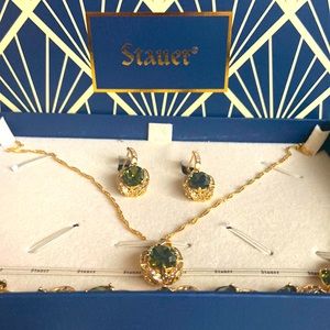 Stauer bracelet, necklace, and earring set. Green gems all across and diamonds around the green gems