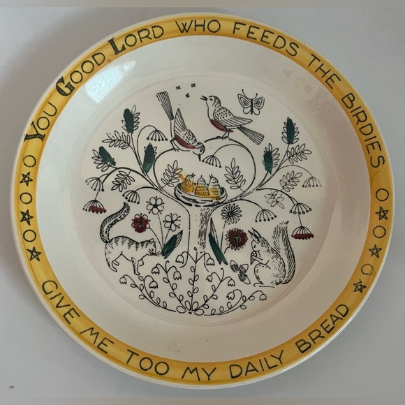 Charming decorative plate featuring birds and animals. Yellow border with text / child’s dinner blessing adds a unique touch. This is a mid-century folk art piece made in Norway. See pics for measurements.