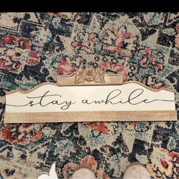 Charming decorative sign with 'Stay Awhile' text. Features a floral accent on top. Perfect for home decor.