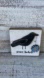This distressed, layered wood block has a design with a primitive bird holding a flower on a dangling wire. It shows a crow holding a blue flower and reads, "stay awhile." This whimsical block measures 4" square by 0.75" thick and includes a keyhole hanger.