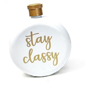 - 1 small stainless steel flask, oval, white with gold script ‘Stay Classy,’ by NPW London, new without tags, holds 3 oz.