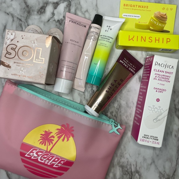 Staycation Bundle includes: LE Sol Body Prosecco Punch , Paradox Conditioner, Grown Alchemist Anti Pollution Primer, Soroci Serum, Kinship Eye Cream, Shea Butter Hand Cream, Pacifica Clean Shot, in a fun ipsy bag. All new, as shown-great deal!