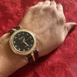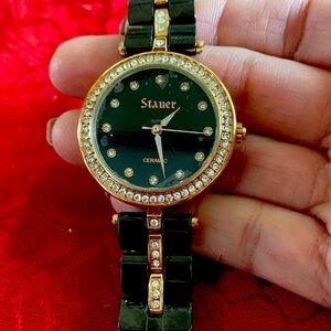 The Stauer woman’s, elegant, black, ceramic watch is a stunning piece that does not come with its original packaging. It features a rose gold finished case that looks very elegant and it’s suitable for every day wear from running errands to attending dinner. Crafted with precision movement the watch is also water resistant up to three ATM, making it both functional and fashionable. The watch is made from ceramic, which makes it lightweight, tough and incredibly scratch resistant, ensuring its durability and wearability. The luxurious Rosegold finish bezel and Crystal studded hour makers elevate the beauty of the watch and make it a perfect accessory for every day use. Please note That a new battery will be required before use as it has not been used recently