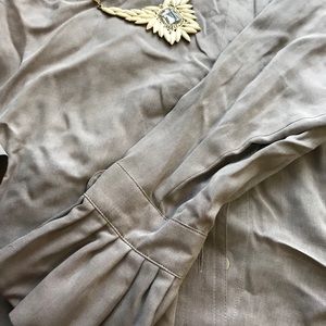 This came to me with tags however I took them off and only wore it once 😭 adorable shirt but the color grey is better for lighter skin tones or darker. THIS IS A STEAL!!!!!! Super couture and super cute !!! Don’t miss! Will iron before sipping. Beyond soft, real silk.