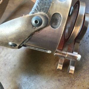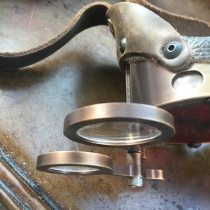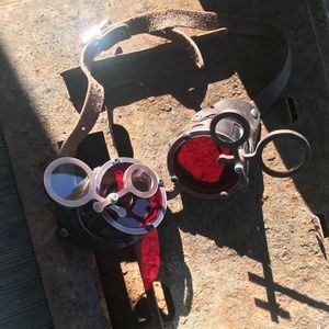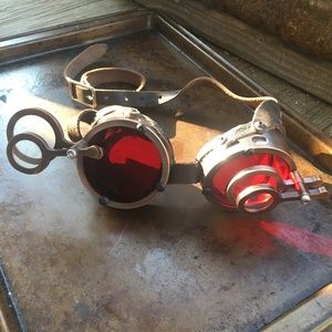 Custom Machined Aviator Inspector Goggles /Post-Apocalyptic / Dystopian Cosplay / Wasteland Welding / Steampunk / Burning Man custom handmade goggles by Apocalypse Hardware, Albuquerque NM. Machined 6061 Aluminum Inspector Goggles w/antiqued bronze anodized finish. Lined w/quality leather w/leather straps. Fully movable lenses and lots of bolts making them easy to customize. Comes w/Dark Grey Lenses and adjustment tool. Originally purchased in Haight Ashbury San Francisco for a photoshoot one time use.