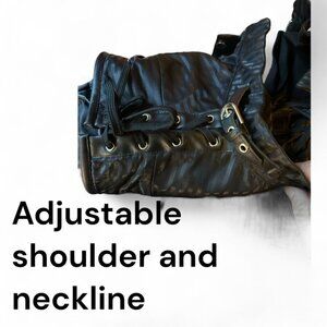 Features: Zip and snap front, adjustable lace-up back, metal embellishments, lined