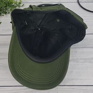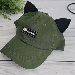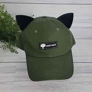A fun olive green baseball cap with black cat ears and steampunk glasses in the back. New without tags.