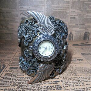 This chunky piece features a watch face in the center, flanked by wings and ornate filigree findings. Since the watch face appears to be firmly affixed to the cuff, it is for design effect only and does not work.