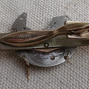 Vintage tie clasp is made with a vintage base that is 12k gold. It has a vintage steel watch plate, a vintage copper gear bead, a vintage watch knob, and vintage watch hands as dangles. One of a kind. 2 inches long and about 1 1/8 inches high. Great for steampunk costumes or everyday wear.