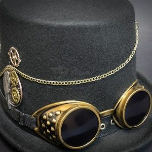 Steampunk top hat. Mad scientist theme, comes with goggles and chains.