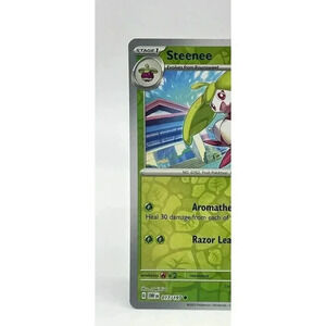 This Steenee card from the Scarlet & Violet - Obsidian Flames set is a rare find for any Pokemon TCG collector. With a reverse holo finish and in mint, unplayed condition, this card showcases the character's Stage 1 evolution and has an HP of 90.