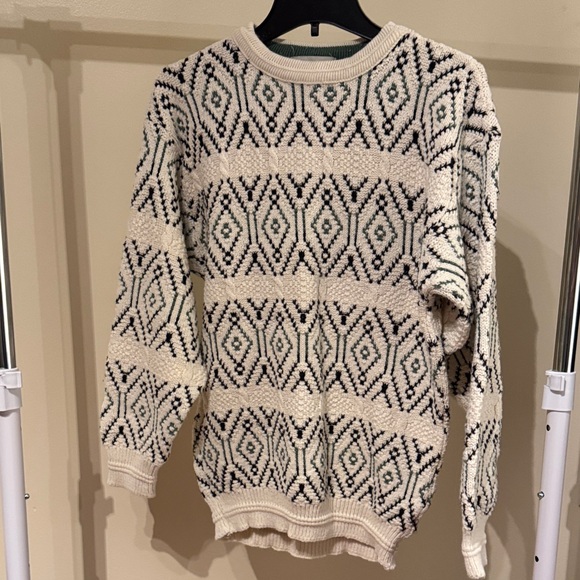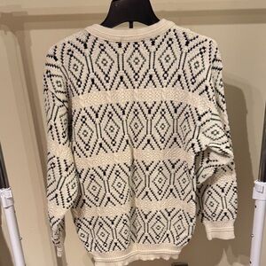 Very thick and warm. Elevate your wardrobe with this stylish geometric patterned crewneck sweater. Featuring a classic cream and black design, it's perfect for any casual outing.