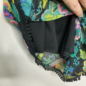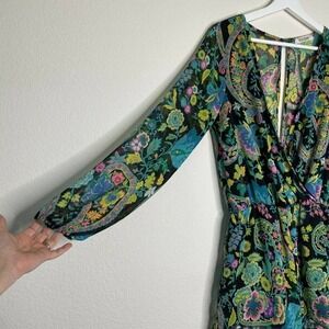 Gorgeous romper by Steezyer! Long sleeves with elastic trim at cuffs for a slight blouson effect. Romper is black with shades of blue, yellow, pink, etc. Bodice is a faux wrap. Back is thinly slit to waist. Button tab closure at top of neck. Shorts are lined in black and have a crochet trim. So cute and easily dressed up or down. All measurements are approximate, taken flat and closed.