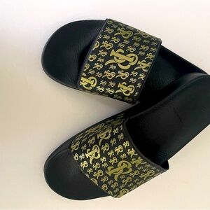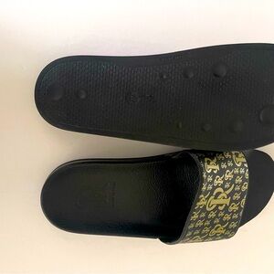 Elegant black slides with gold logo pattern. Ideal for casual wear. Comfortable and stylish.Shoes new without box