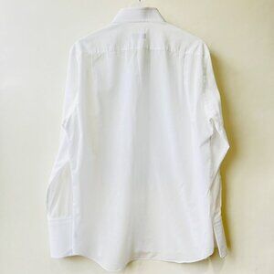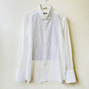 Features: tuxedo shirt collar, contrasting threads pleated bib, thin cotton fabric, folded cuffs