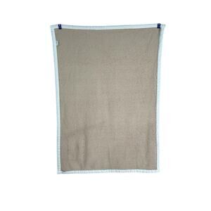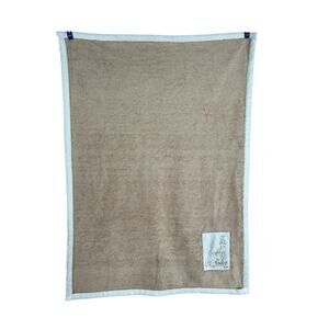 Baby blanket from Steiff. Tan with a white trim. Has a patch with a cute elephant, bear, and bunny rabbit. Preowned with signs of wear to fabric from normal washing and use including some matting of the trim. No stains. Stitching coming out of trim on one part - see pictures.