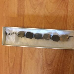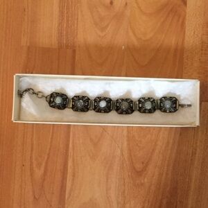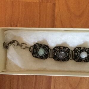 This was a gift that I never wore. It came from Steinbach. It is lightweight metal with raised resin opalescent orbs and filigree twists, and hook latch as closure. Bracelet measures 8 inches fro end of chain to latch.