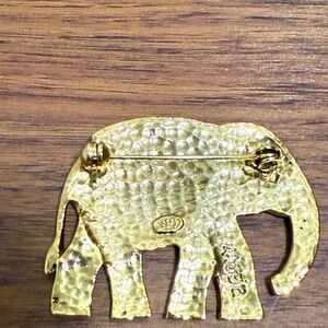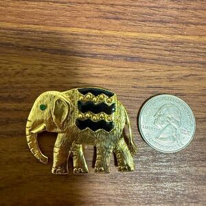 Gold tone Steinmetz SFJ signed vintage gold tone elephant brooch with black enamel and green rhinestone eye. 1970’d to 1980’s. C clasp closure.