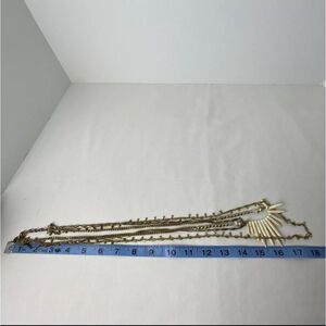 This stunning Stella & Dot Zuni Gold-Tone Layered Multi-Strand Necklace is a masterpiece of intricate design and bold elegance. Featuring a multi-strand layout, this piece seamlessly blends an edgy and sophisticated look. Its standout centerpiece includes striking white spikes reminiscent of natural bone or tusk designs, giving it an earthy yet chic appeal.