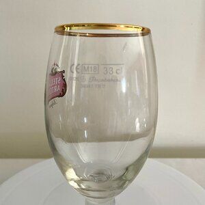 This Stella Artois beer glass features a classic gold rim, standing 8 inches tall, and is perfect for collectors or beer enthusiasts. Its elegant design enhances any collection or dining experience.