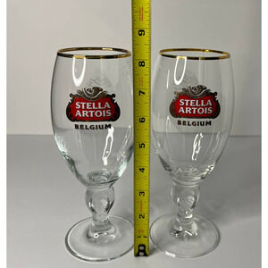 Stella Artois Belgium Chalice Glasses Pair of 2 Beer Goblets Gold Rim 8.5" 40CL