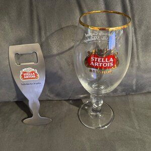Stella Artois Holiday Glass with Bottle Opener. Glass holds 16 fluid oz and it is rimmed with gold. Both are in great condition with no chips or cracks.