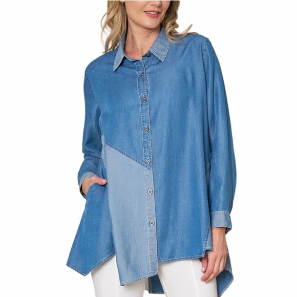 Very light, flowy soft Tencel fabric shades of blue button up tunic top with pockets. Features a sleek design. Ideal for everyday wear.