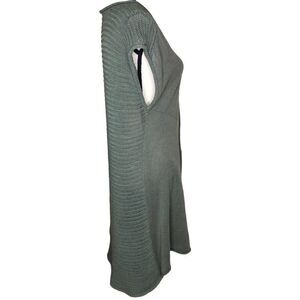 Casual, fun, artistic, tunic sweater in a neutral gray green. The slit up the front adds to the swingy movement, and the open knit in back adds texture. The cover photo shows style and fit. The actual top is shown in following photos. In excellent condition. There is a snag or tie off on the inside in back. Does not show.