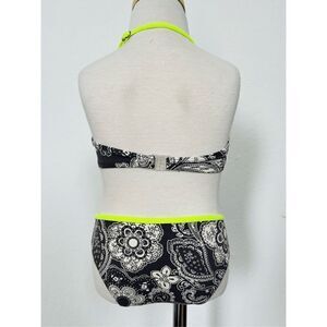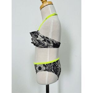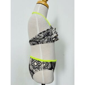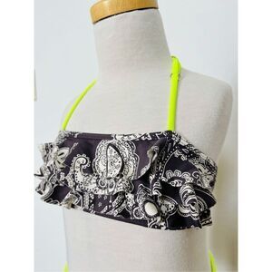 Lovely 2-piece bathing suit with ruffle detail and adjustable strap for the perfect fit. Darling paisley print. 90% polyamide, 10% elastane. Excellent preowned condition.