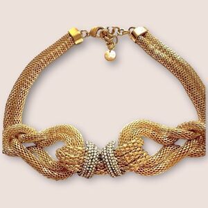 This exquisite Stella & Dot Admiral necklace showcases a harmonious blend of gold and silver tones, featuring a unique knotted design that sits elegantly as a collar necklace / choker.