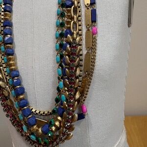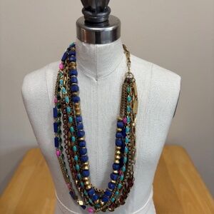 Four layers of chains, colorful beads, & thread wrapped sparkle intertwine with vintage gold. Versatile with 4 removable strands and a removable extender. Hook closure. Brand new. Comes in original packaging.